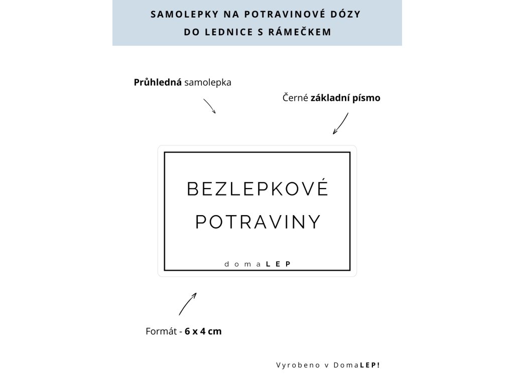 BEZLEPKOVÉ POTRAVINY průhledná samolepka s rámečkem, základní písmo, rozměr 6 × 4 cm na boxy, šuplíky a dózy do lednice