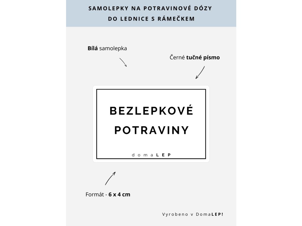 BEZLEPKOVÉ POTRAVINY bílá samolepka s rámečkem, tučné písmo, rozměr 6 × 4 cm na boxy, šuplíky a dózy do lednice
