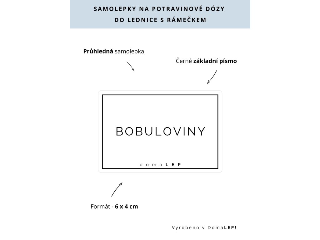 BOBULOVINY průhledná samolepka s rámečkem, základní písmo, rozměr 6 × 4 cm na boxy, šuplíky a dózy do lednice