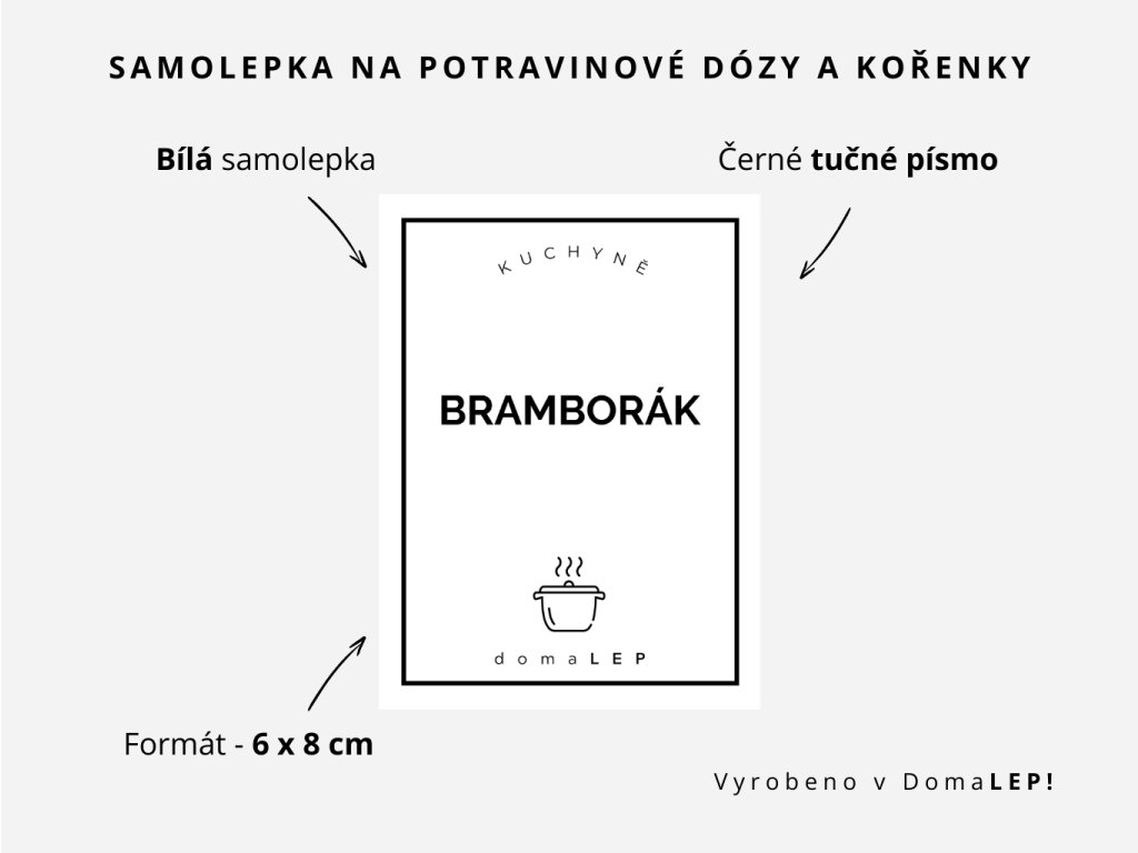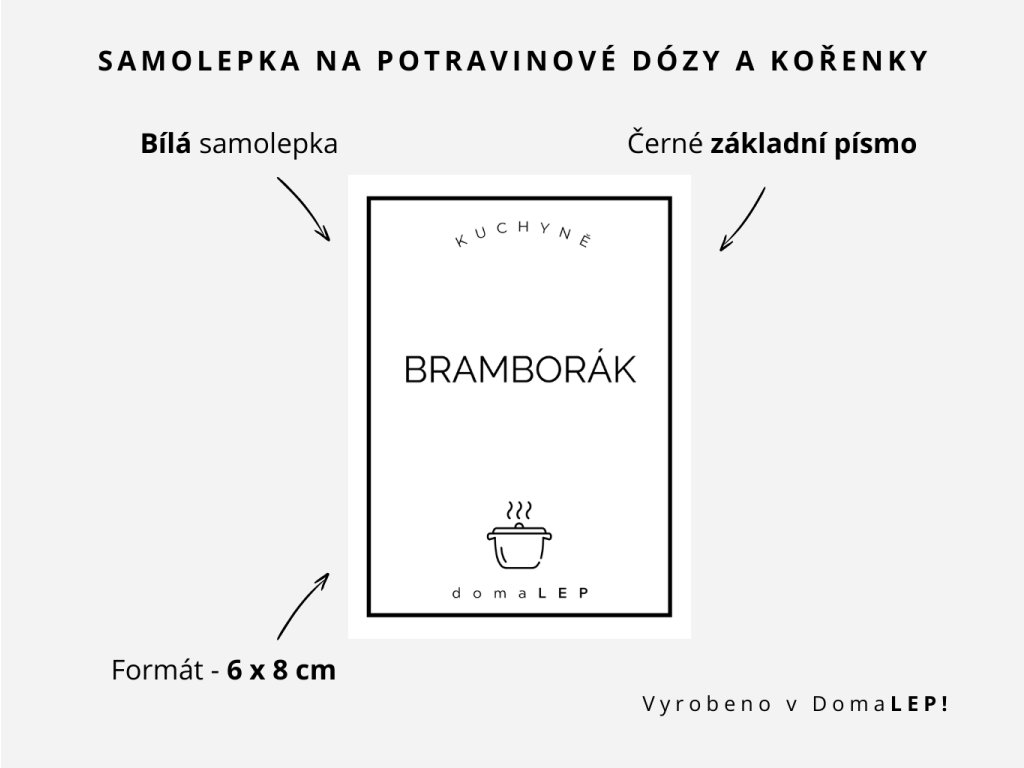 - Univerzální použití: Naše samolepky jsou vhodné na plastové, skleněné, keramické nebo nerezové nádoby. Díky hladkému povrchu se snadno aplikují a pevně drží na svém místě.