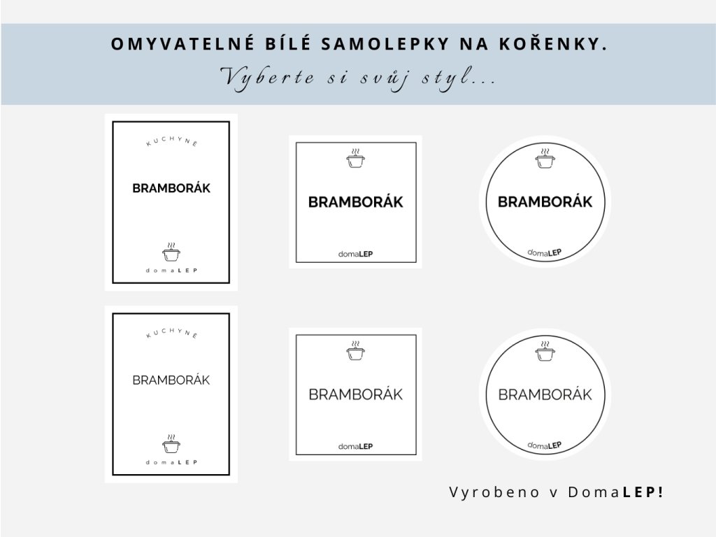 BRAMBORÁK rozměr Ø 5 cm / 5 x 5 cm / 6 x 8 cm - bílá vinylová voděodolná omyvatelná samolepka na kořenky