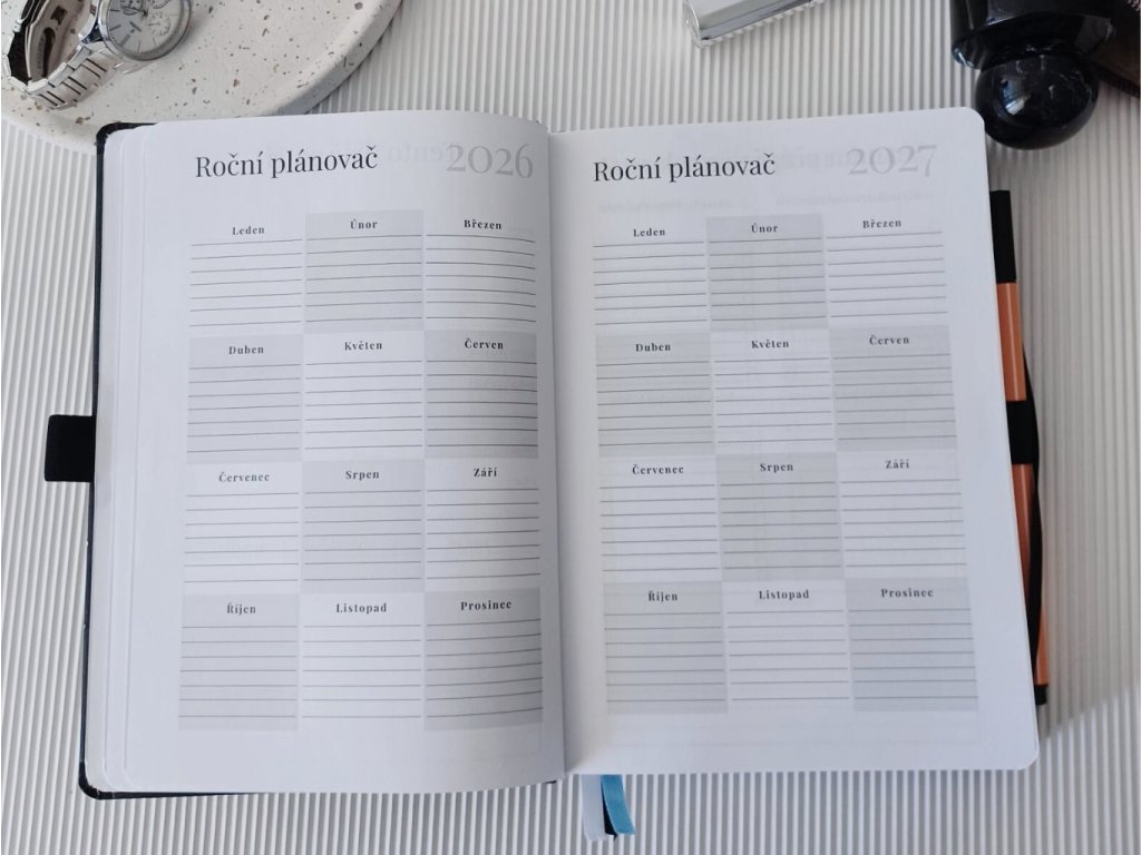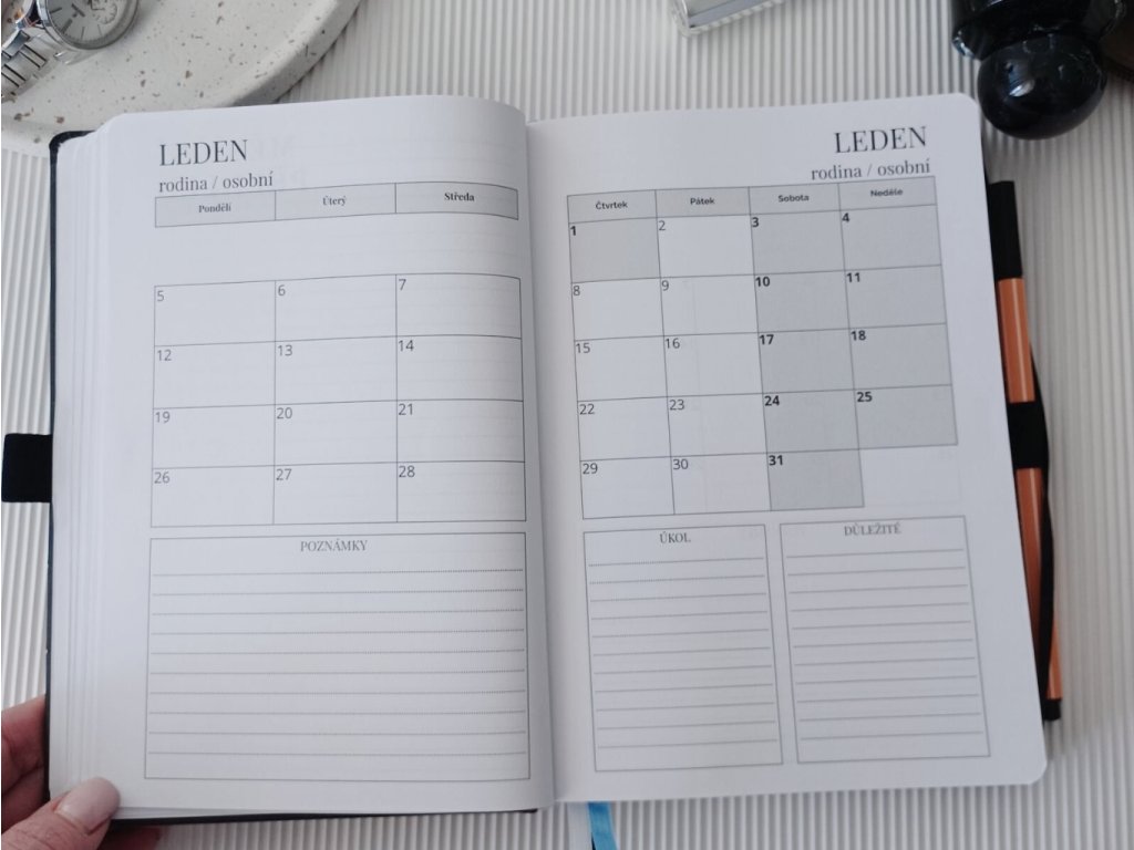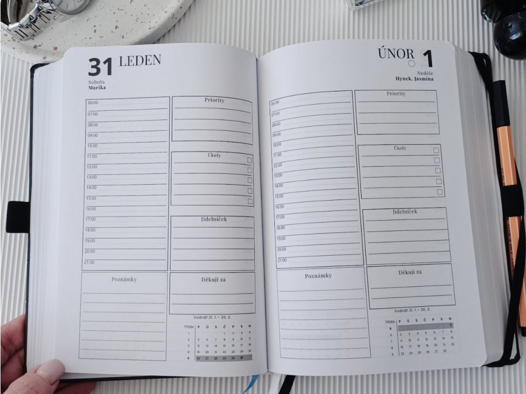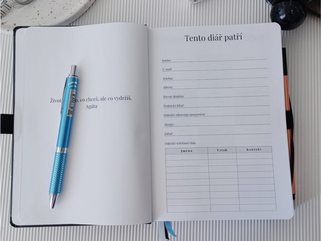 Ve spolupráci s Agátou Hanychovou jsme navrhli jedinečný multifunkční diář v českém jazyce, který slouží jako každodenní organizér, plánovač, i praktický pomocník pro finance, zdraví, práci, rodinu i čas pro sebe.