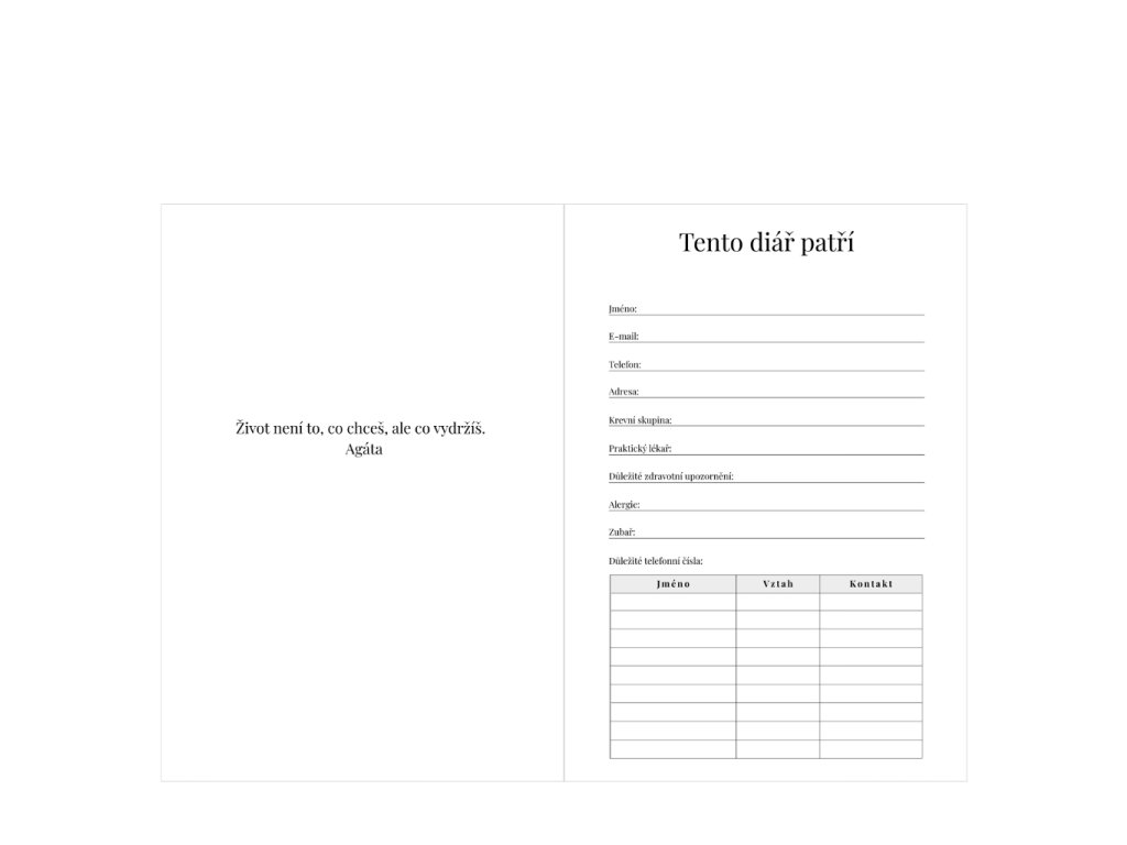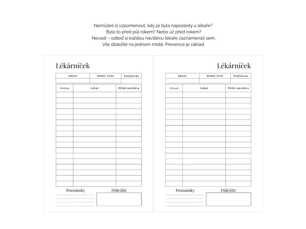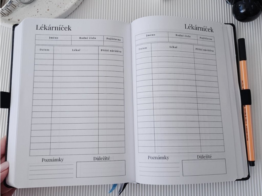 V diáři najdete prostor na zdraví, finance, školní rozvrhy, seznam kontaktů, hesel, cyklus, lékaře i vlastní reflexi.