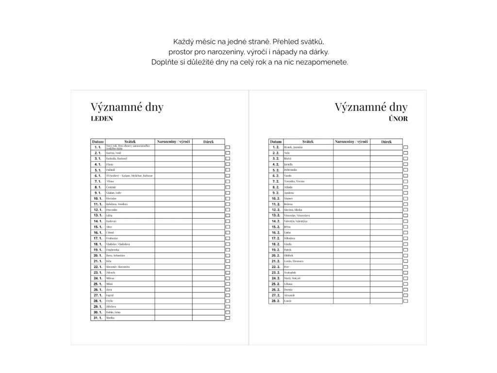 Denní kalendář od 6 do 21 hodin, měsíční přehledy svátků, plánovače, kapsa na dokumenty, tři stužky, gumička i pevná obálka.