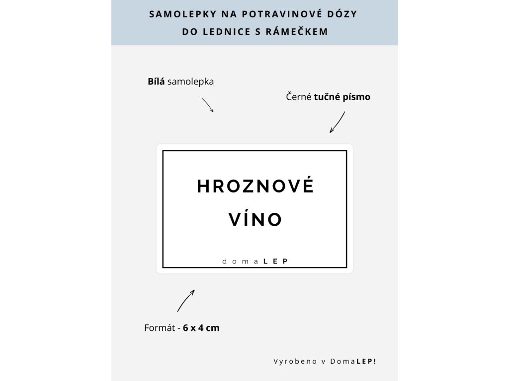 HROZNOVÉ VÍNO bílá samolepka s rámečkem, tučné písmo, rozměr 6 × 4 cm na boxy, šuplíky a dózy do lednice