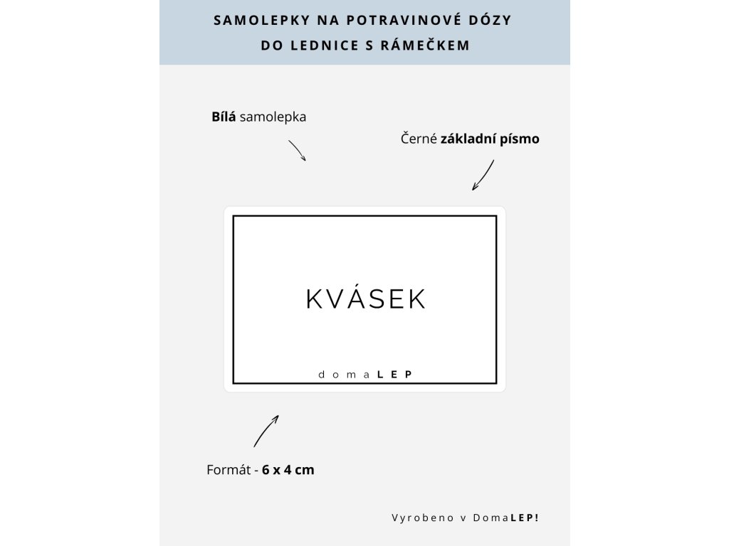 KVÁSEK bílá samolepka s rámečkem, základní písmo, rozměr 6 × 4 cm na boxy, šuplíky a dózy do lednice