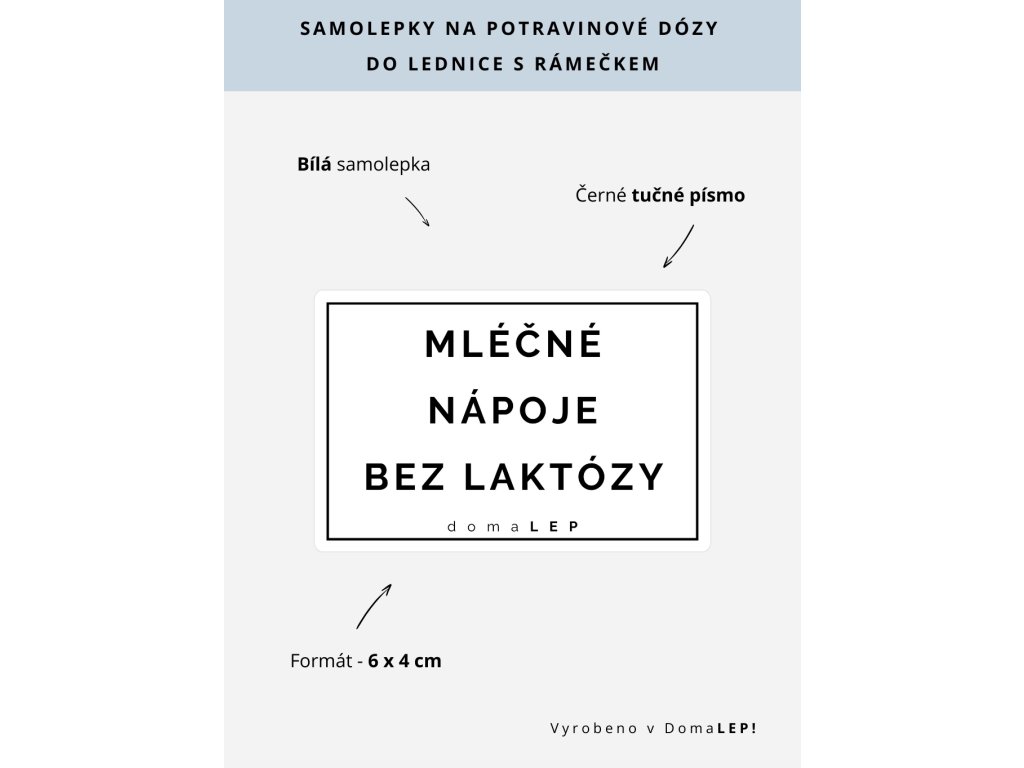MLÉČNÉ NÁPOJE BEZ LAKTÓZY bílá samolepka s rámečkem, tučné písmo, rozměr 6 × 4 cm na boxy, šuplíky a dózy do lednice