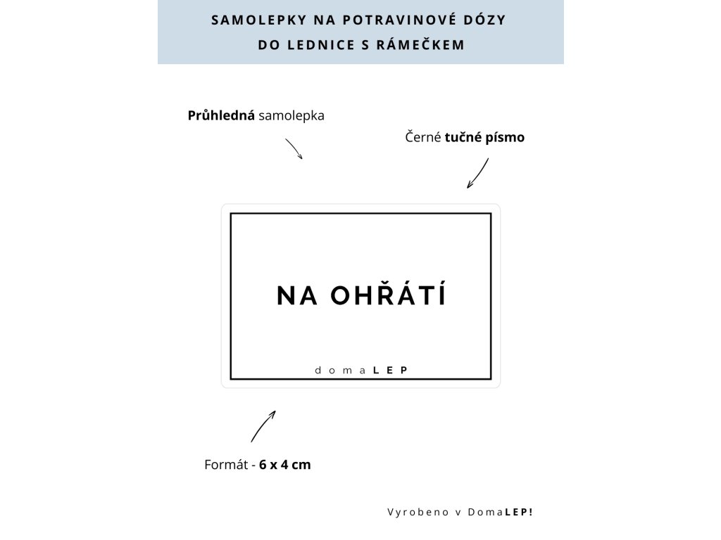 ORGANIZAČNÍ SAMOLEPKY NA BOXY, DÓZY A ŠUPLÍKY DO LEDNICE. Efektivní řešení pro přehledné uspořádání lednice. Průhledná samolepka s rámečkem NA OHŘÁTÍ v tučném písmu pomáhá minimalizovat plýtvání potravinami, urychluje orientaci a přináší harmonii do každodenního fungování domácnosti. Uspořádejte svou lednici s lehkostí a elegancí díky našim praktickým štítkům.