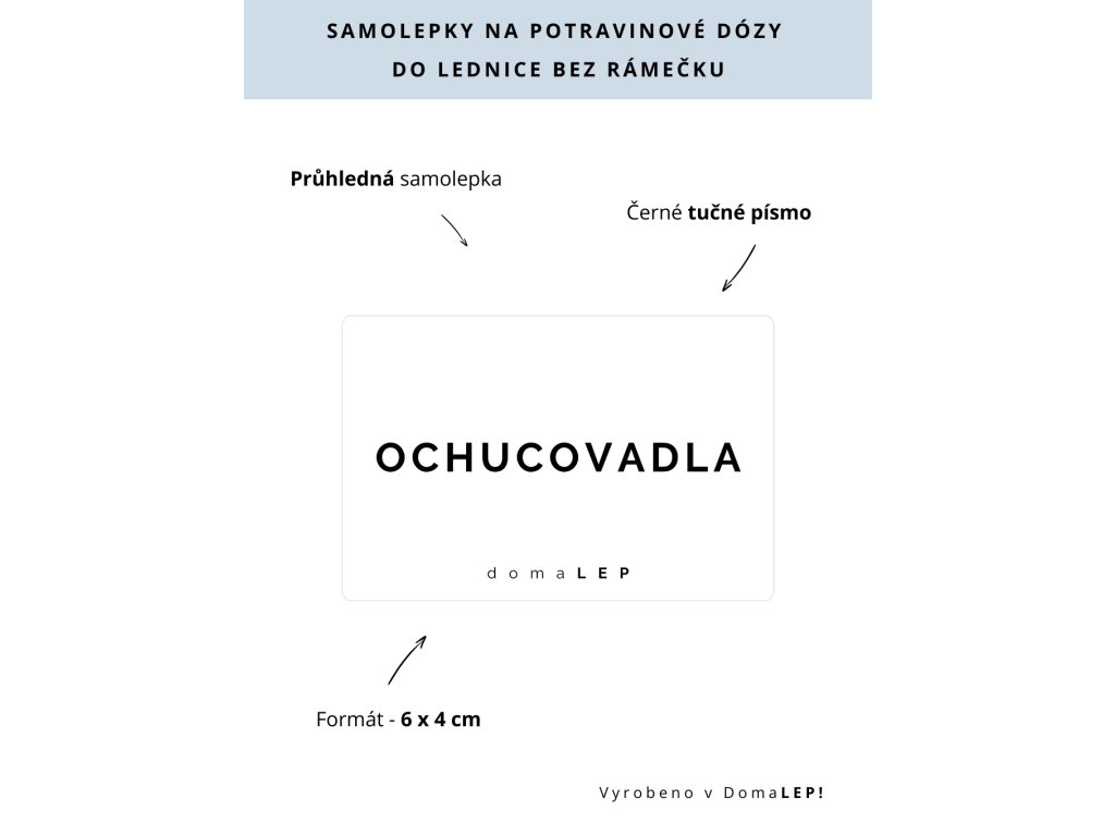 ORGANIZAČNÍ SAMOLEPKY NA BOXY, DÓZY A ŠUPLÍKY DO LEDNICE. Efektivní řešení pro přehledné uspořádání lednice. Průhledná samolepka bez rámečku OCHUCOVADLA v tučném písmu pomáhá minimalizovat plýtvání potravinami, urychluje orientaci a přináší harmonii do každodenního fungování domácnosti. Uspořádejte svou lednici s lehkostí a elegancí díky našim praktickým štítkům.Doplňkové parametry