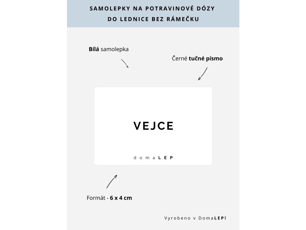 VEJCE bílá samolepka bez rámečku, tučné písmo, rozměr 6 × 4 cm na boxy, šuplíky a dózy do lednice