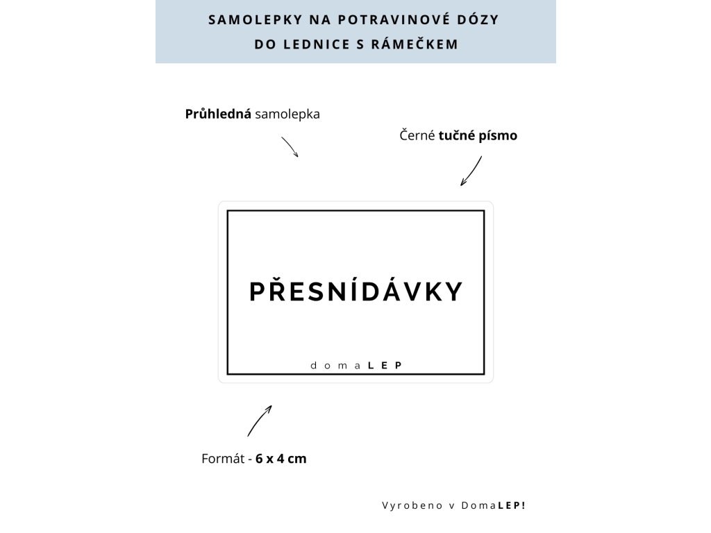 PŘESNÍDÁVKY průhledná samolepka s rámečkem, tučné písmo, rozměr 6 × 4 cm na boxy, šuplíky a dózy do lednice