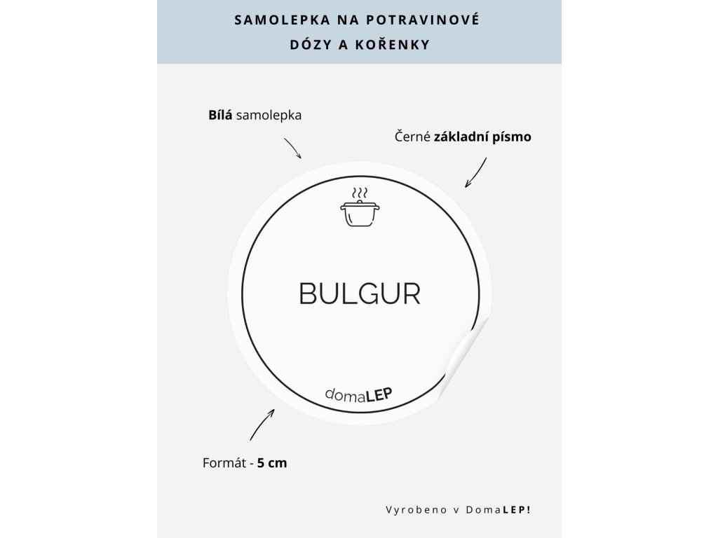 BULGUR – bílá samolepka o průměru 5 cm v základním písmu usnadní přehledné označení potravinových dóz.