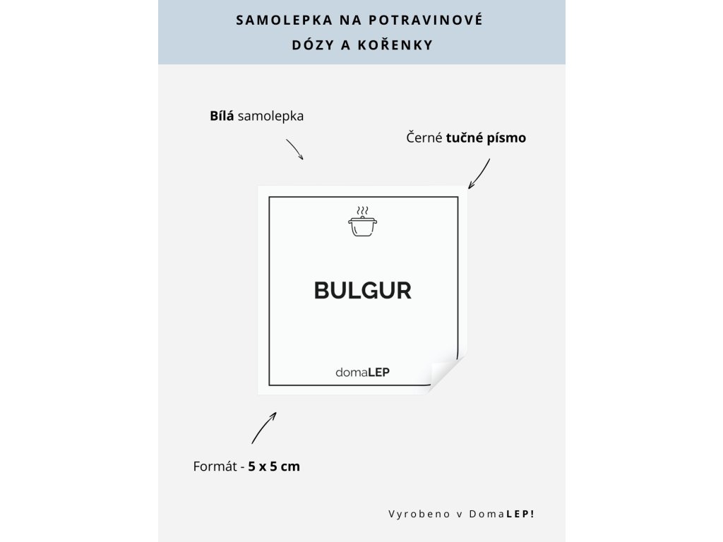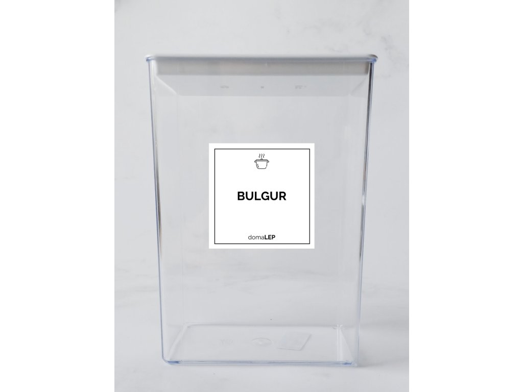 BULGUR – bílá samolepka o rozměru 5 × 5 v tučném písmu usnadní přehledné označení potravinových dóz.