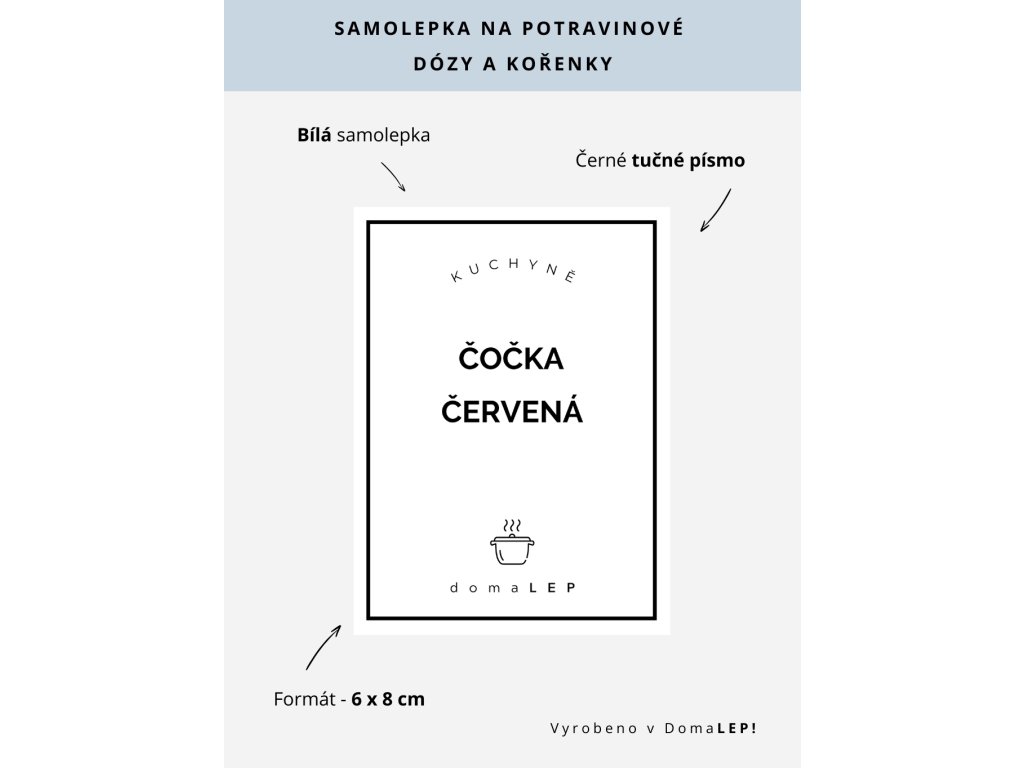 ČOČKA ČERVENÁ – bílá samolepka o rozměru 6 × 8 v tučném písmu usnadní přehledné označení potravinových dóz.