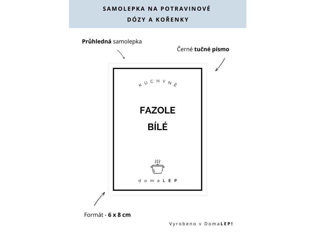 FAZOLE BÍLÉ 6 × 8 cm – průhledná vinylová, voděodolná, omyvatelná samolepka na dózy, tučné písmo