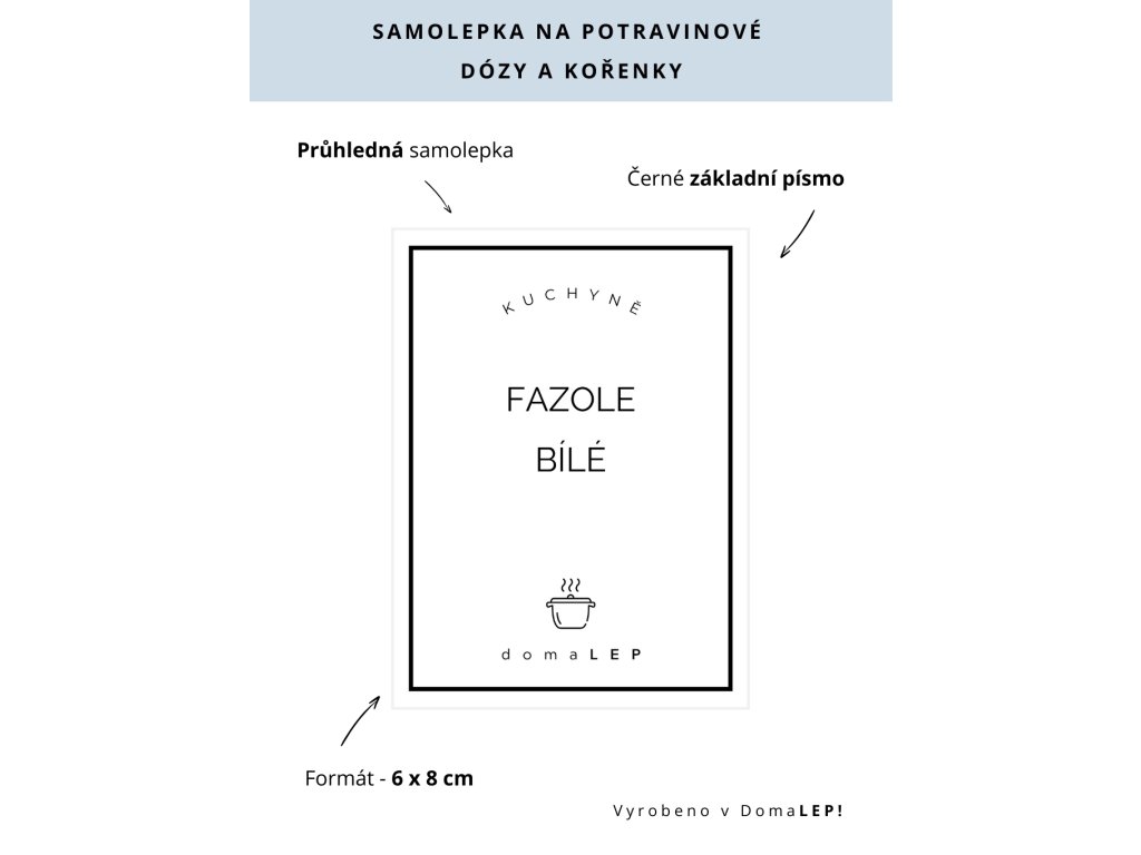 FAZOLE BÍLÉ 6 × 8 cm – průhledná vinylová, voděodolná, omyvatelná samolepka na dózy, základní písmo