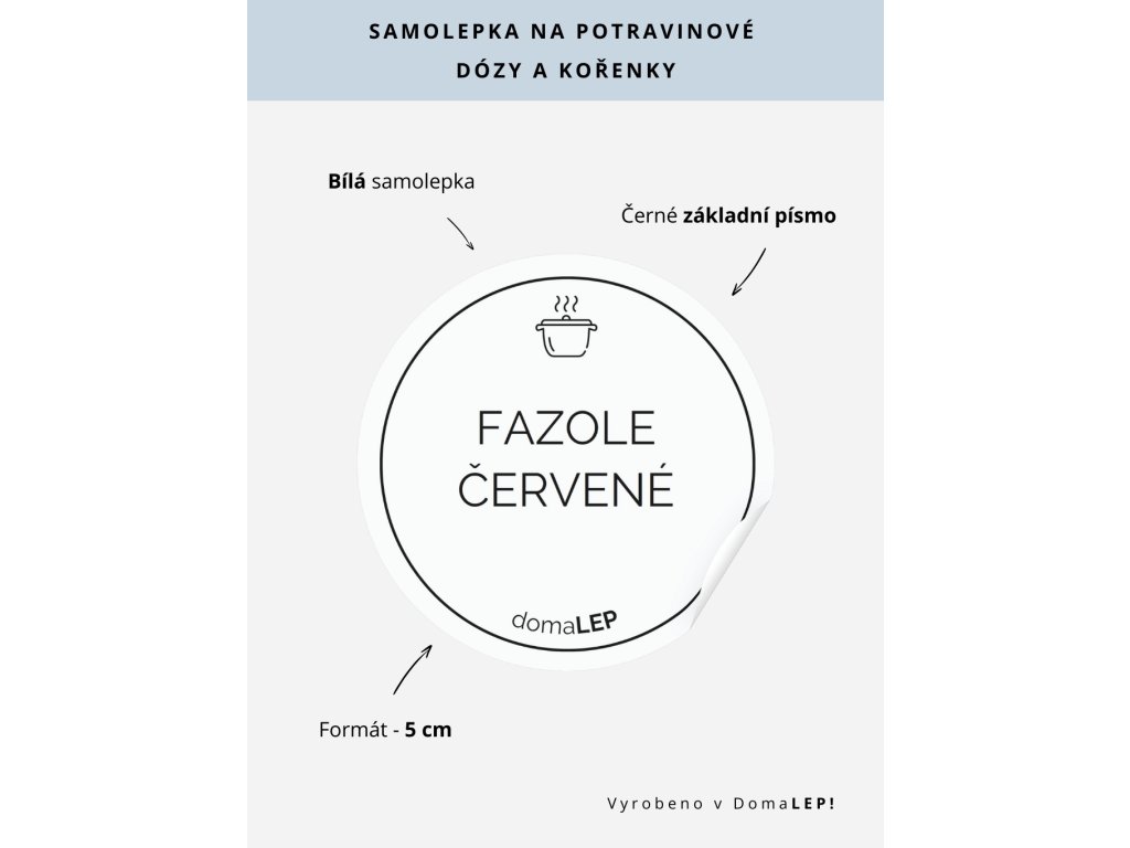 FAZOLE ČERVENÉ – bílá samolepka o průměru 5 cm v základním písmu usnadní přehledné označení potravinových dóz.