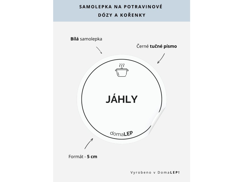 JÁHLY – bílá samolepka o průměru 5 cm v tučném písmu usnadní přehledné označení potravinových dóz.