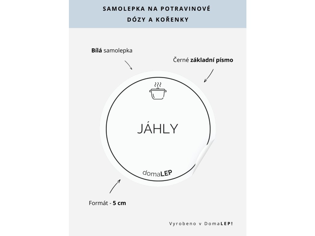 JÁHLY – bílá samolepka o průměru 5 cm v základním písmu usnadní přehledné označení potravinových dóz.