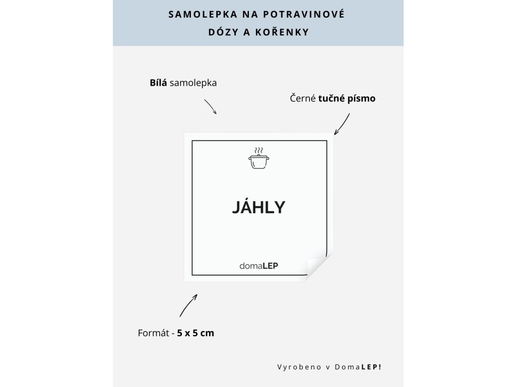 JÁHLY – bílá samolepka o rozměru 5 × 5 v tučném písmu usnadní přehledné označení potravinových dóz.