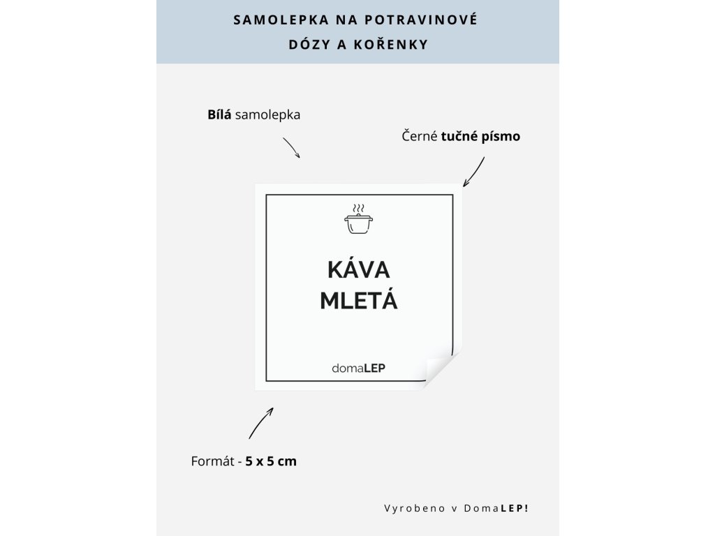KÁVA MLETÁ – bílá samolepka o rozměru 5 × 5 cm v tučném písmu usnadní přehledné označení potravinových dóz.