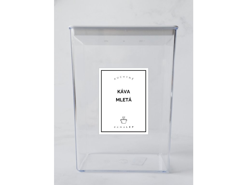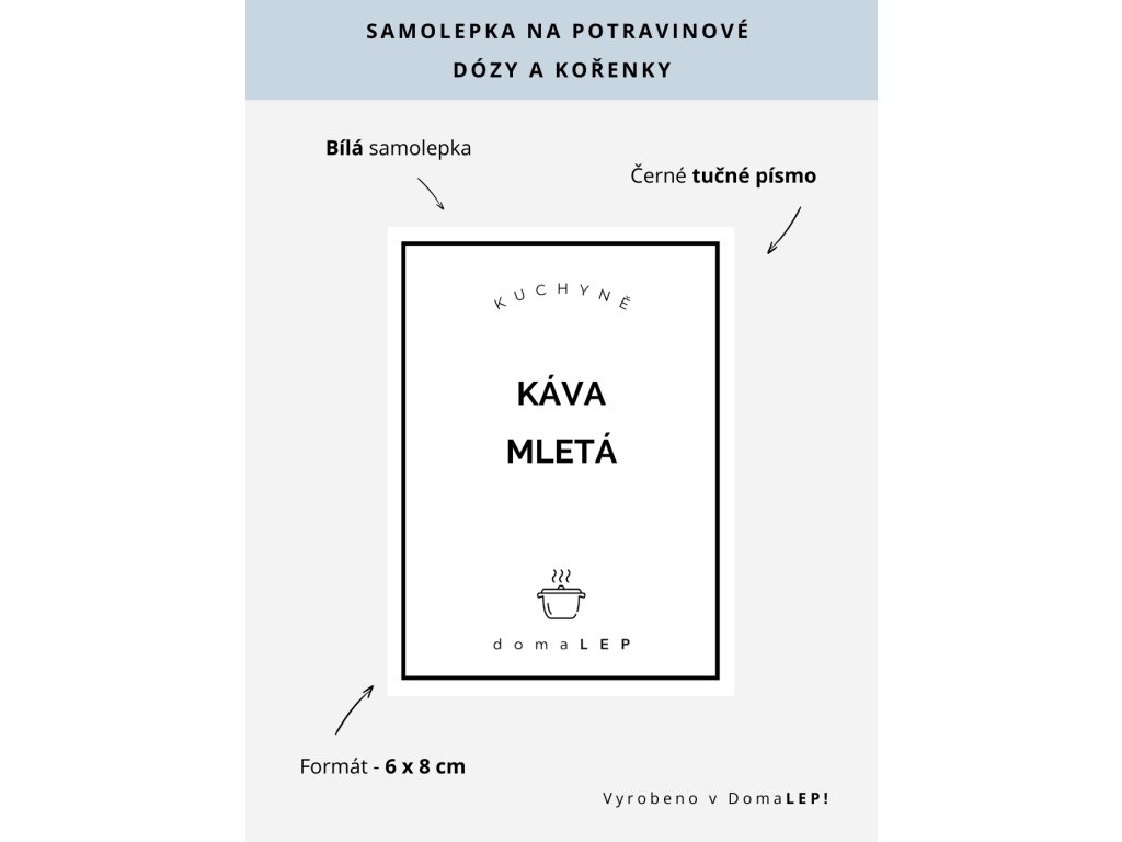 KÁVA MLETÁ – bílá samolepka o rozměru 6 × 8 cm v tučném písmu usnadní přehledné označení potravinových dóz.