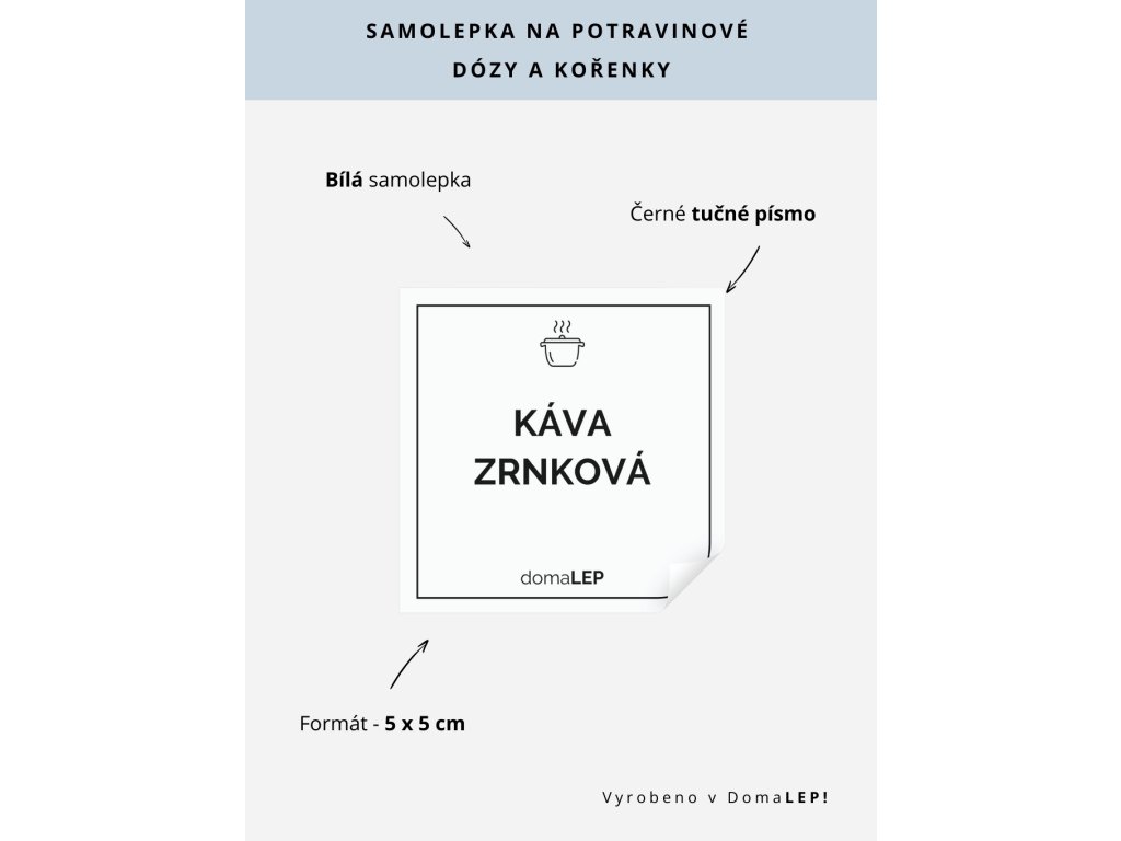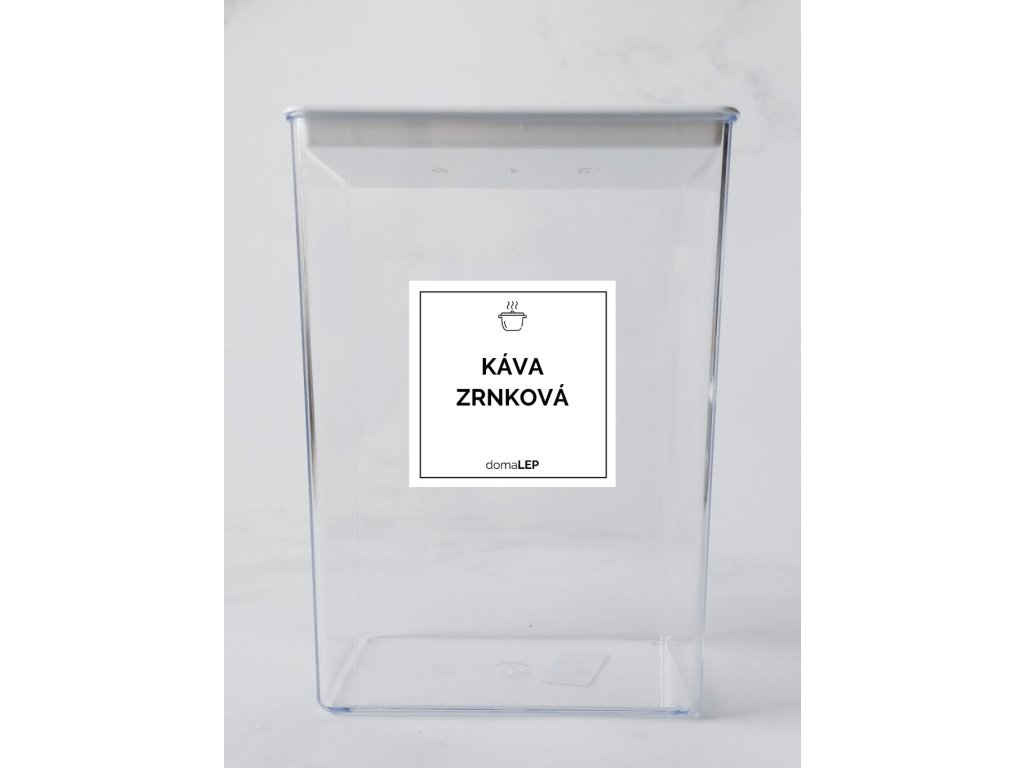 KÁVA ZRNKOVÁ – bílá samolepka o rozměru 5 × 5 cm v tučném písmu usnadní přehledné označení potravinových dóz.