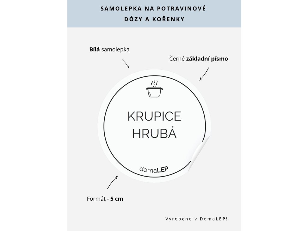 KRUPICE HRUBÁ – bílá samolepka o průměru 5 cm v základním písmu usnadní přehledné označení potravinových dóz.