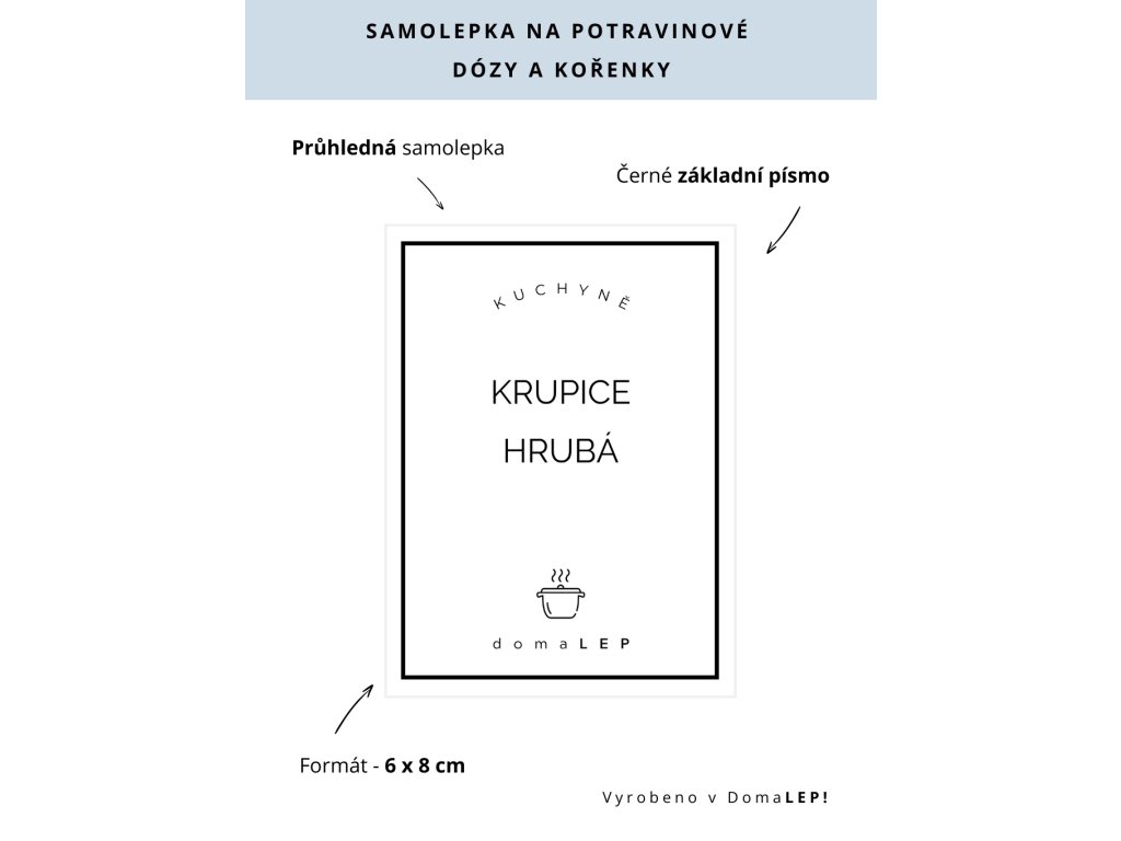 KRUPICE HRUBÁ – průhledná samolepka o rozměru 6 × 8 cm v základním písmu usnadní přehledné označení potravinových dóz.