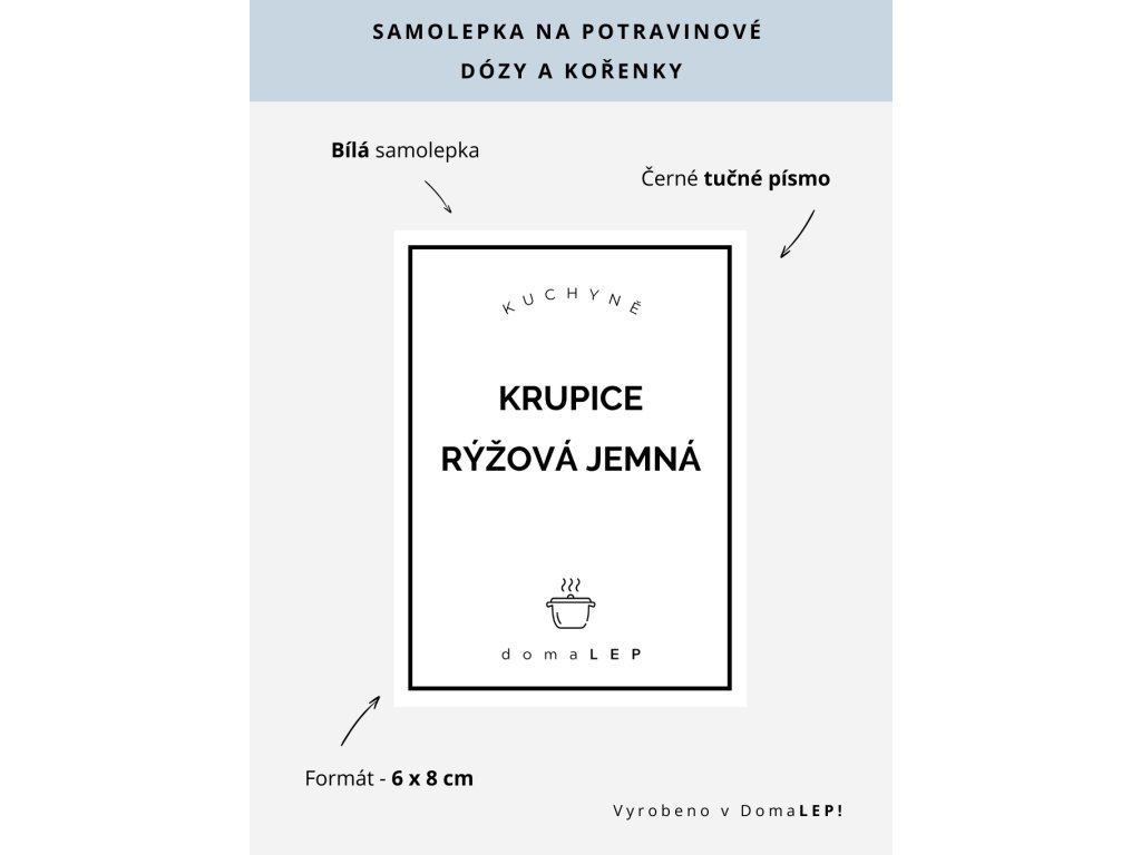 KRUPICE RÝŽOVÁ JEMNÁ – bílá samolepka o rozměru 6 × 8 cm v tučném písmu usnadní přehledné označení potravinových dóz.