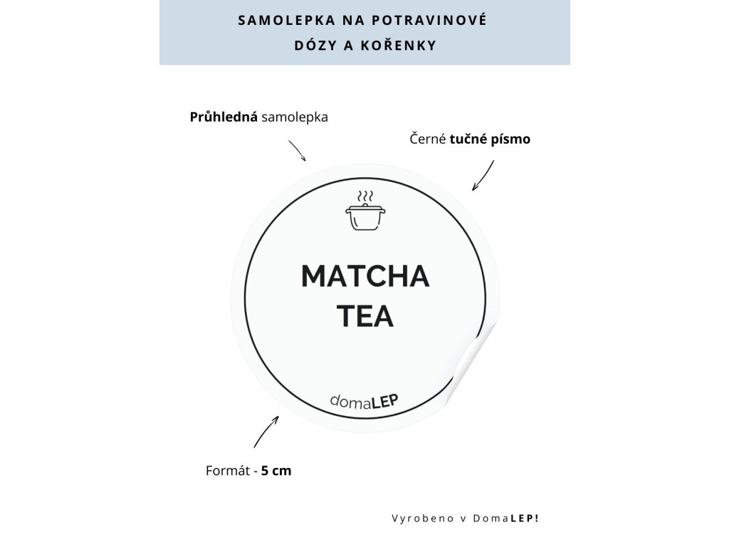MATCHA TEA – průhledná samolepka o průměru 5 cm v tučném písmu usnadní přehledné označení potravinových dóz,