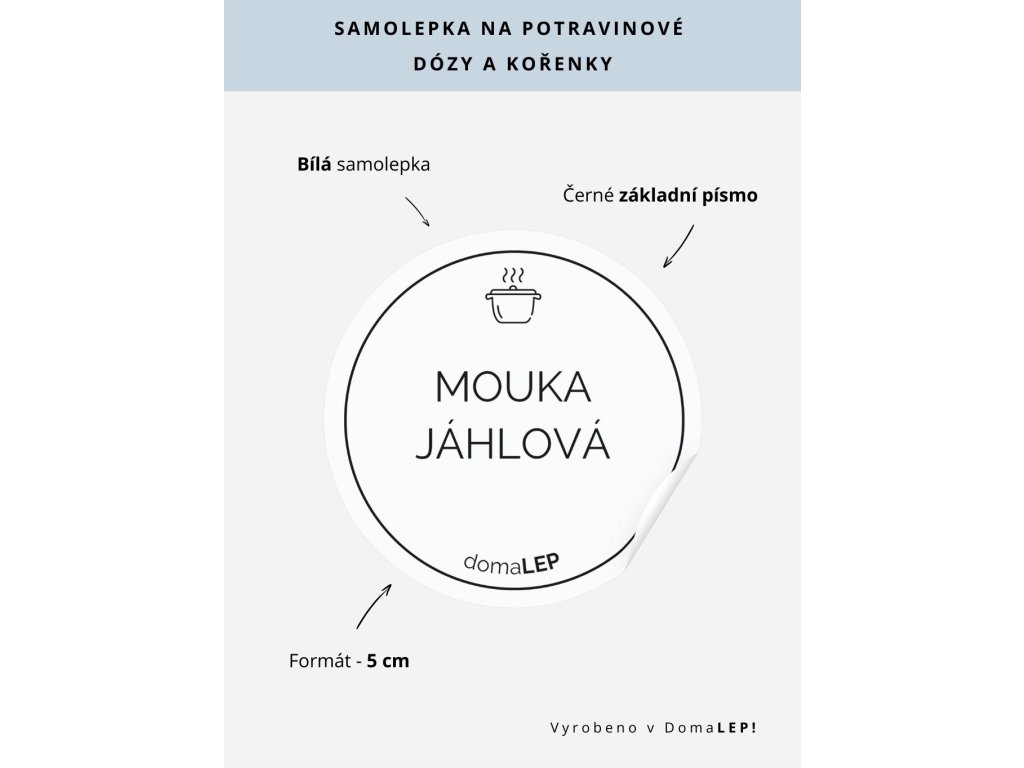 MOUKA JÁHLOVÁ – bílá samolepka o průměru 5 cm v základním písmu usnadní přehledné označení potravinových dóz.