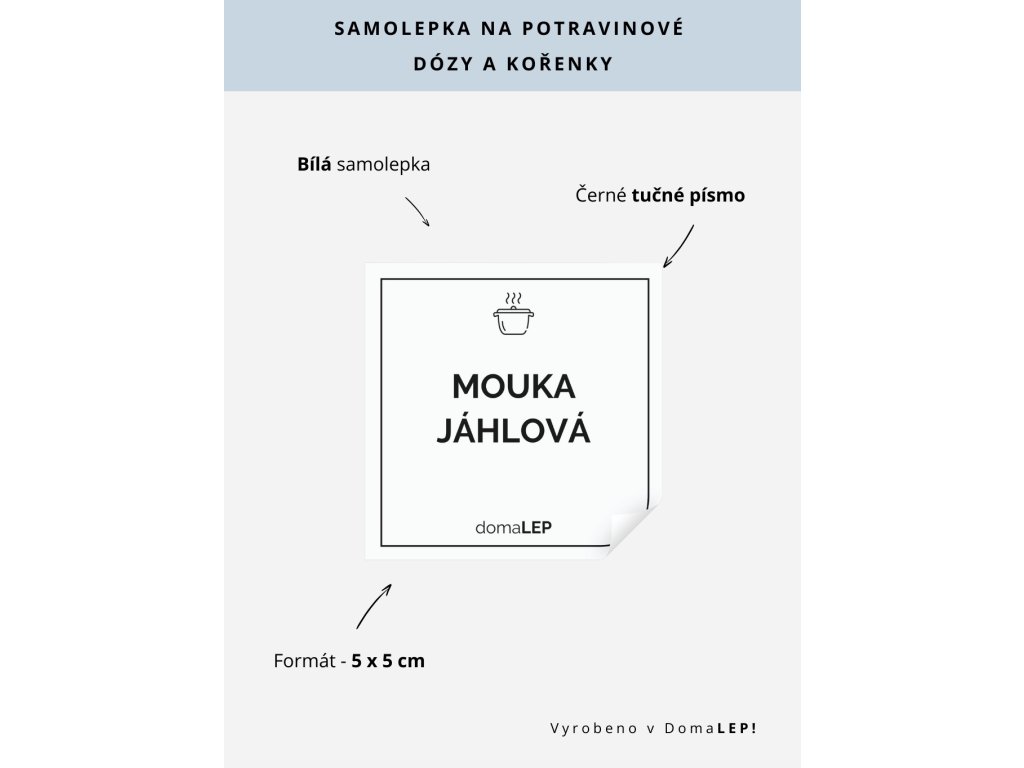 MOUKA JÁHLOVÁ – bílá samolepka o rozměru 5 × 5 cm v tučném písmu usnadní přehledné označení potravinových dóz.