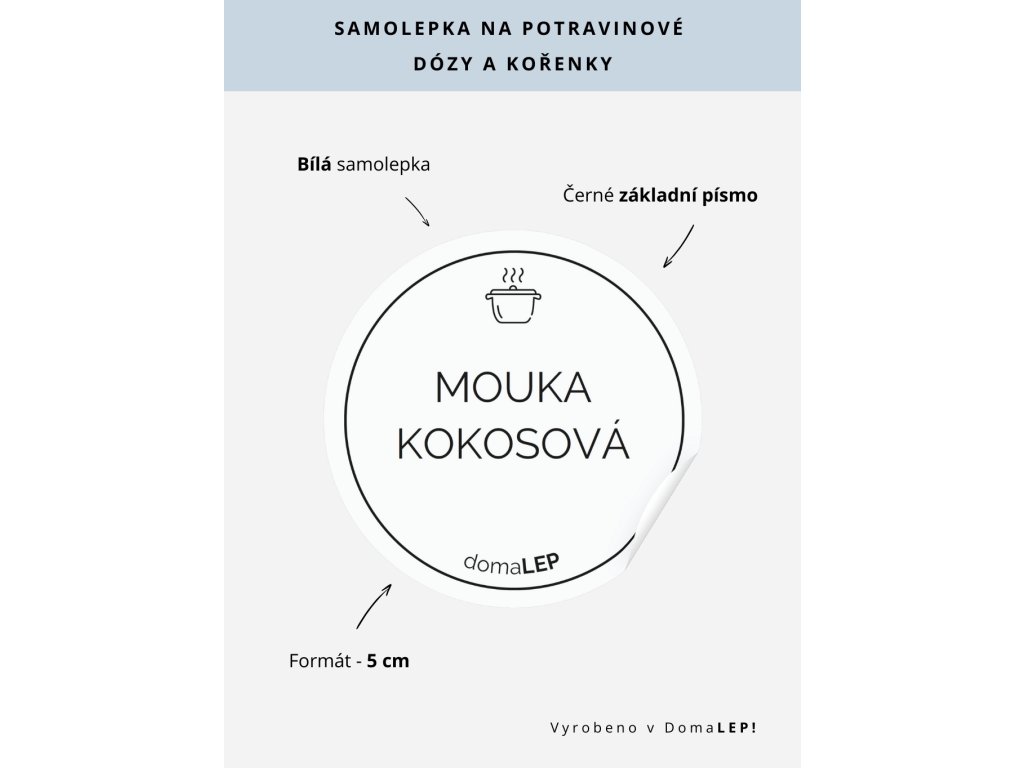 MOUKA KOKOSOVÁ – bílá samolepka o průměru 5 cm v základním písmu usnadní přehledné označení potravinových dóz.