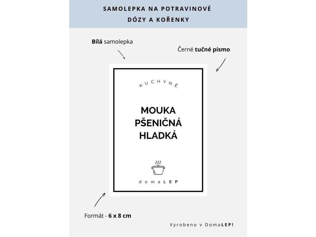 MOUKA PŠENIČNÁ HLADKÁ – bílá samolepka o rozměru 6 × 8 cm v tučném písmu usnadní přehledné označení potravinových dóz.