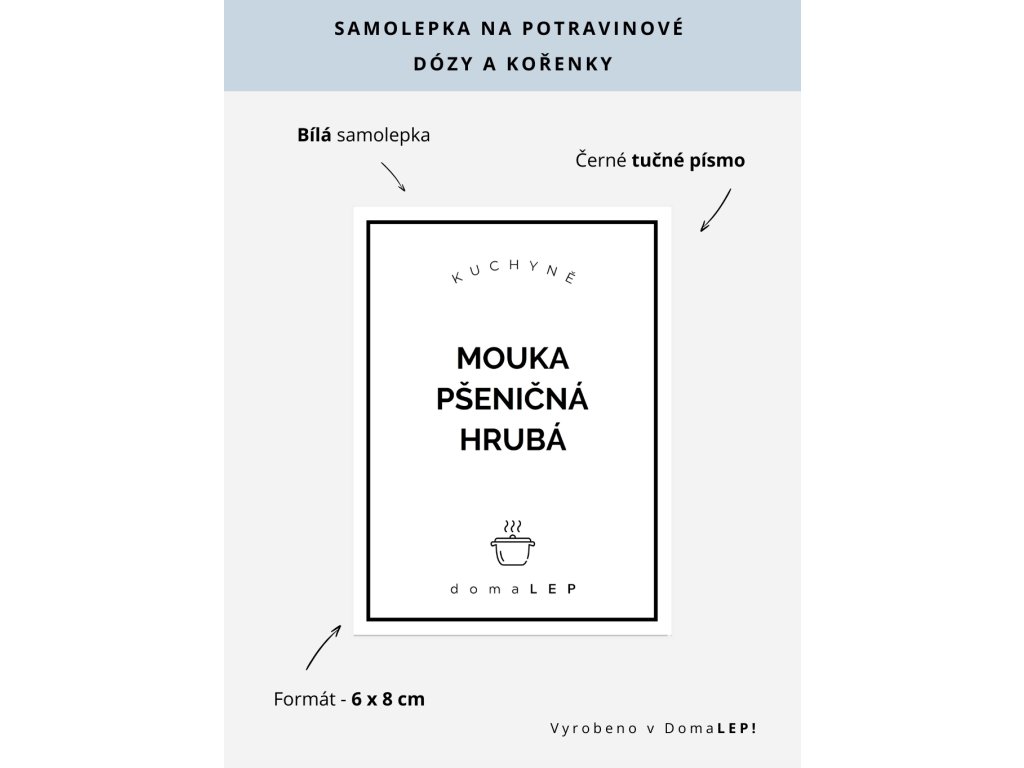 MOUKA PŠENIČNÁ HRUBÁ – bílá samolepka o rozměru 6 × 8 cm v tučném písmu usnadní přehledné označení potravinových dóz.