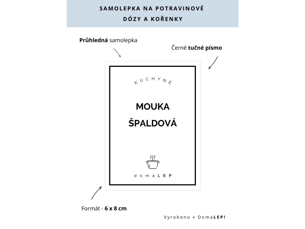 MOUKA ŠPALDOVÁ – průhledná samolepka o rozměru 6 × 8 cm v tučném písmu usnadní přehledné označení potravinových dóz.
