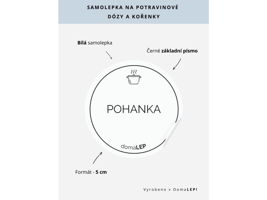 POHANKA – bílá samolepka o průměru 5 cm v základním písmu usnadní přehledné označení potravinových dóz.