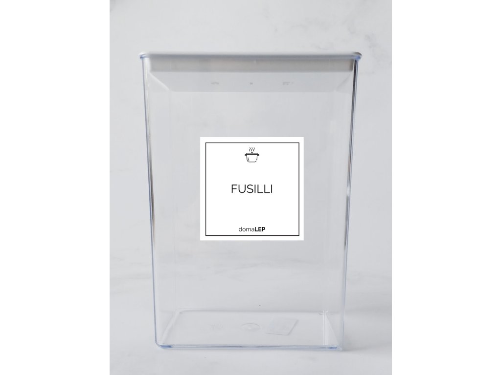 FUSILLI – bílá samolepka o rozměru 5 x 5 cm v základním písmu usnadní přehledné označení potravinových dóz.