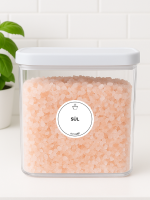 HIMALÁJSKÁ SŮL průměr 5 cm – bílá v tučném písmu, omyvatelná samolepka na potravinové dózy