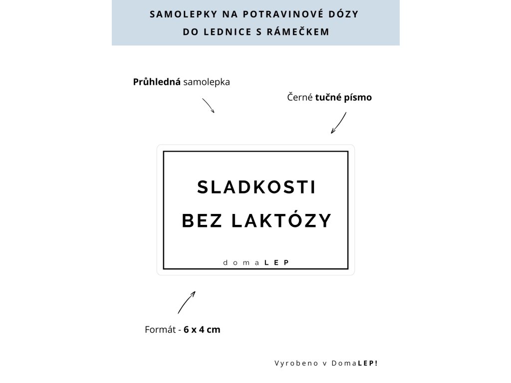 SLADKOSTI BEZ LAKTÓZY průhledná samolepka s rámečkem, tučné písmo, rozměr 6 × 4 cm na boxy, šuplíky a dózy do lednice