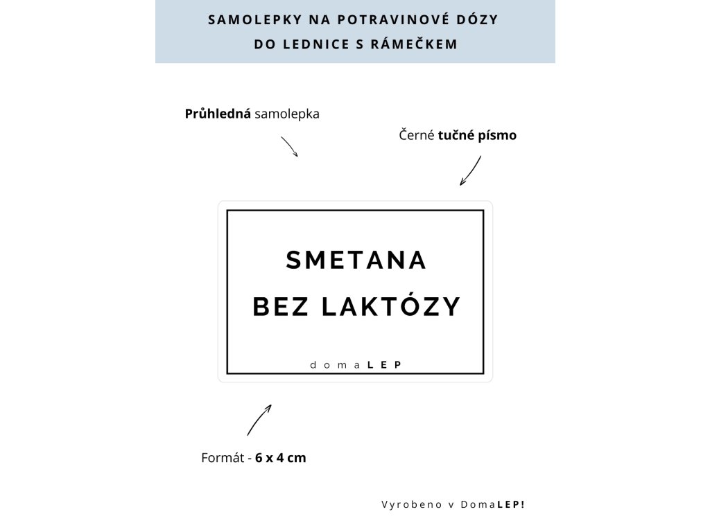 SMETANA BEZ LAKTÓZY průhledná samolepka s rámečkem, tučné písmo, rozměr 6 × 4 cm na boxy, šuplíky a dózy do lednice