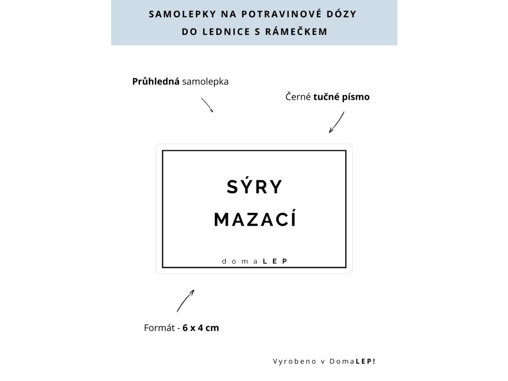 SÝRY MAZACÍ průhledná samolepka s rámečkem, tučné písmo, rozměr 6 × 4 cm na boxy, šuplíky a dózy do lednice