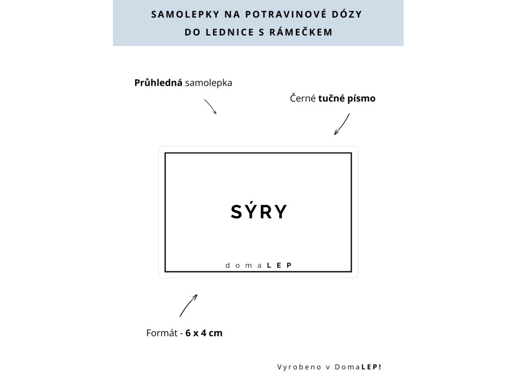 SÝRY průhledná samolepka s rámečkem, tučné písmo, rozměr 6 × 4 cm na boxy, šuplíky a dózy do lednice