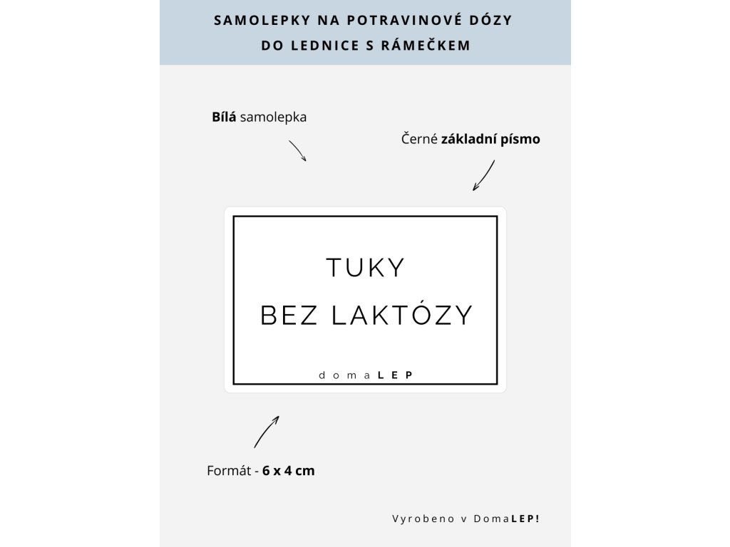 ORGANIZAČNÍ SAMOLEPKY NA BOXY, DÓZY A ŠUPLÍKY DO LEDNICE. Efektivní řešení pro přehledné uspořádání lednice. Bílá samolepka s rámečkem TUKY BEZ LAKTÓZY v základním písmu pomáhá minimalizovat plýtvání potravinami, urychluje orientaci a přináší harmonii do každodenního fungování domácnosti. Uspořádejte svou lednici s lehkostí a elegancí díky našim praktickým štítkům.