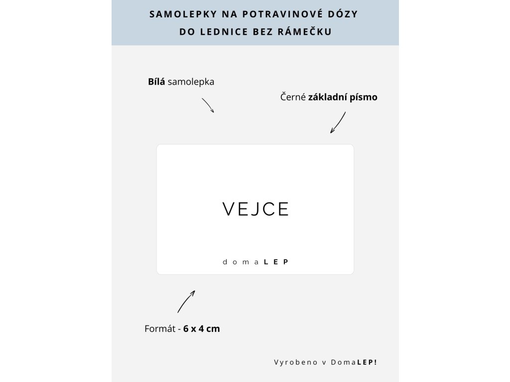 VEJCE bílá samolepka bez rámečku, základní písmo, rozměr 6 × 4 cm na boxy, šuplíky a dózy do lednice
