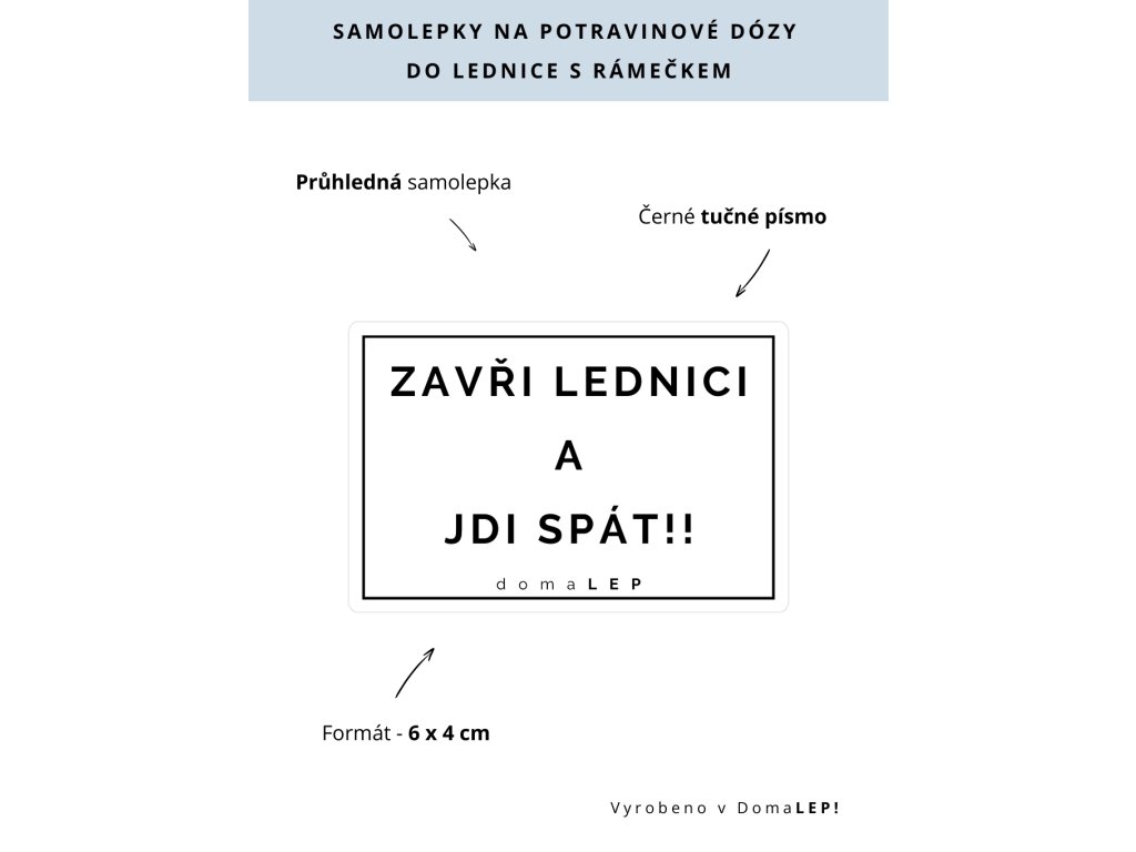 ZAVŘI LEDNICI A JDI SPÁT! průhledná samolepka s rámečkem, tučné písmo, rozměr 6 × 4 cm na boxy, šuplíky a dózy do lednice